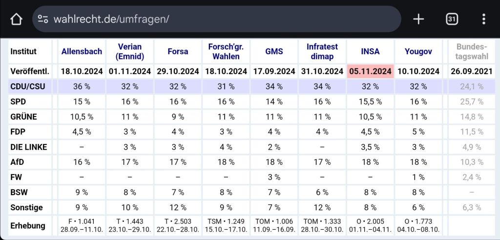 Da stellt sich am Ende nur die Frage, mit wem man koalieren wird. Mit der afd, mit der man nichts zu tun haben will? Mit der BSW? Der SPD und/oder den Grünen? Viel mehr Möglichkeiten gibt es da ja nicht mehr. Nach aktuellem Umfragestand würde die GROKO keine Mehrheit haben und so zur KLEIKO werden.